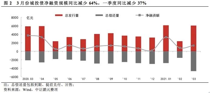 由于1月份的放量發(fā)行遠(yuǎn)超2020年同期,2021年一季度城投債發(fā)行規(guī)模同比大幅增長(zhǎng)34%,但凈融資規(guī)模同比減少37%。