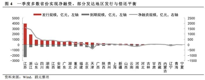 綜合1-3月份的情況來(lái)看,天津市和河南省仍是主要凈償還區(qū)域。云南省和遼寧省的凈償還規(guī)模也超過(guò)100億元。凈發(fā)行規(guī)模較大的省份主要位于東部沿海地區(qū)和中西部核心省份。江蘇、浙江兩省的凈發(fā)行規(guī)模均超過(guò)千億。四川、重慶兩地的凈發(fā)行規(guī)模分別達(dá)到423億元和111億元。同時(shí),部分經(jīng)濟(jì)發(fā)達(dá)地區(qū)如北京和上海的城投債發(fā)行與償還趨于均衡,以城投債資金進(jìn)行基礎(chǔ)設(shè)施建設(shè)的需求較低。