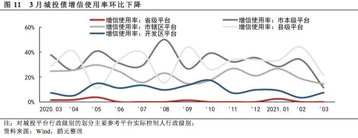 城投債增信使用率環(huán)比下降,城投債融資環(huán)境較好:3月份,城投債總體增信使用率為11.85%,較2月份環(huán)比下降6.1個(gè)百分點(diǎn)。就不同行政級(jí)別的主體來(lái)看,3月份除開發(fā)區(qū)平臺(tái)的增信使用率有所上升以外,其他級(jí)別城投平臺(tái)的增信使用率均環(huán)比下降。由數(shù)據(jù)可知,2020年末城投債融資環(huán)境整體較好。