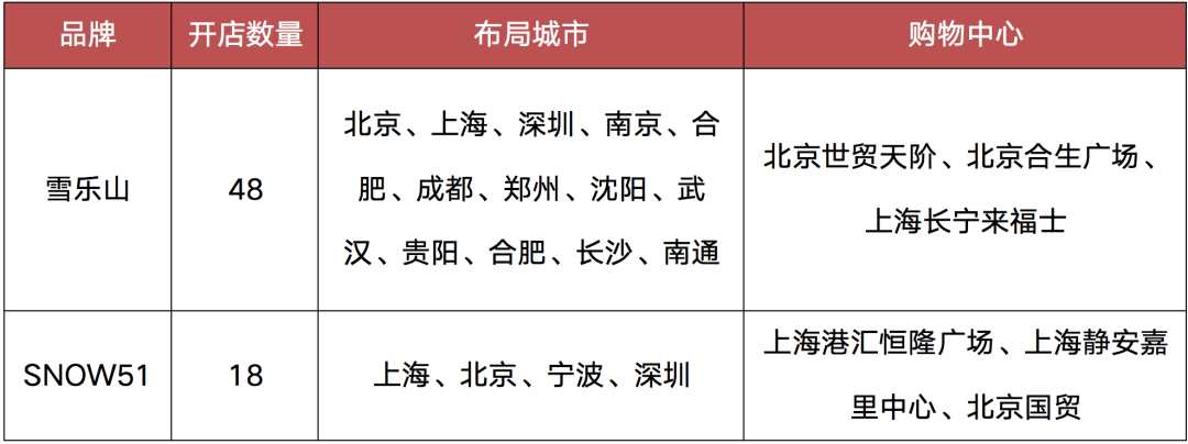 以雪樂山為例,店型分為主力店(600~800平)和迷你店(100平),主力店選址于購物中心,單店投入300萬,資金回籠周期6到12個月,主要布局在一線城市,并向二線城市下沉。而SNOW51則采取會員制高端路線布局一線城市核心商圈,在滑雪運動的基礎上,增加了與品牌聯營的零售、社交和餐飲服務。