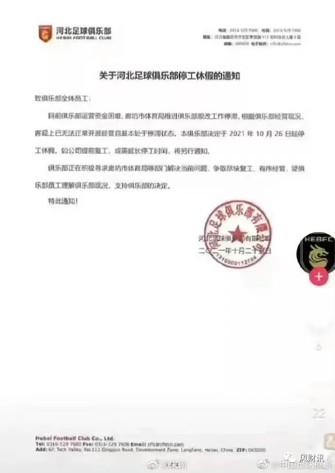 10月26日,河北足球俱樂部下發停工休假通知。通知顯示,俱樂部因為遭遇運營資金困難,無法繼續開展經營活動,于26日起開始停工休假。通知內容也表示,正在尋求市體育局的相關部門解決問題,爭取盡快復工。
