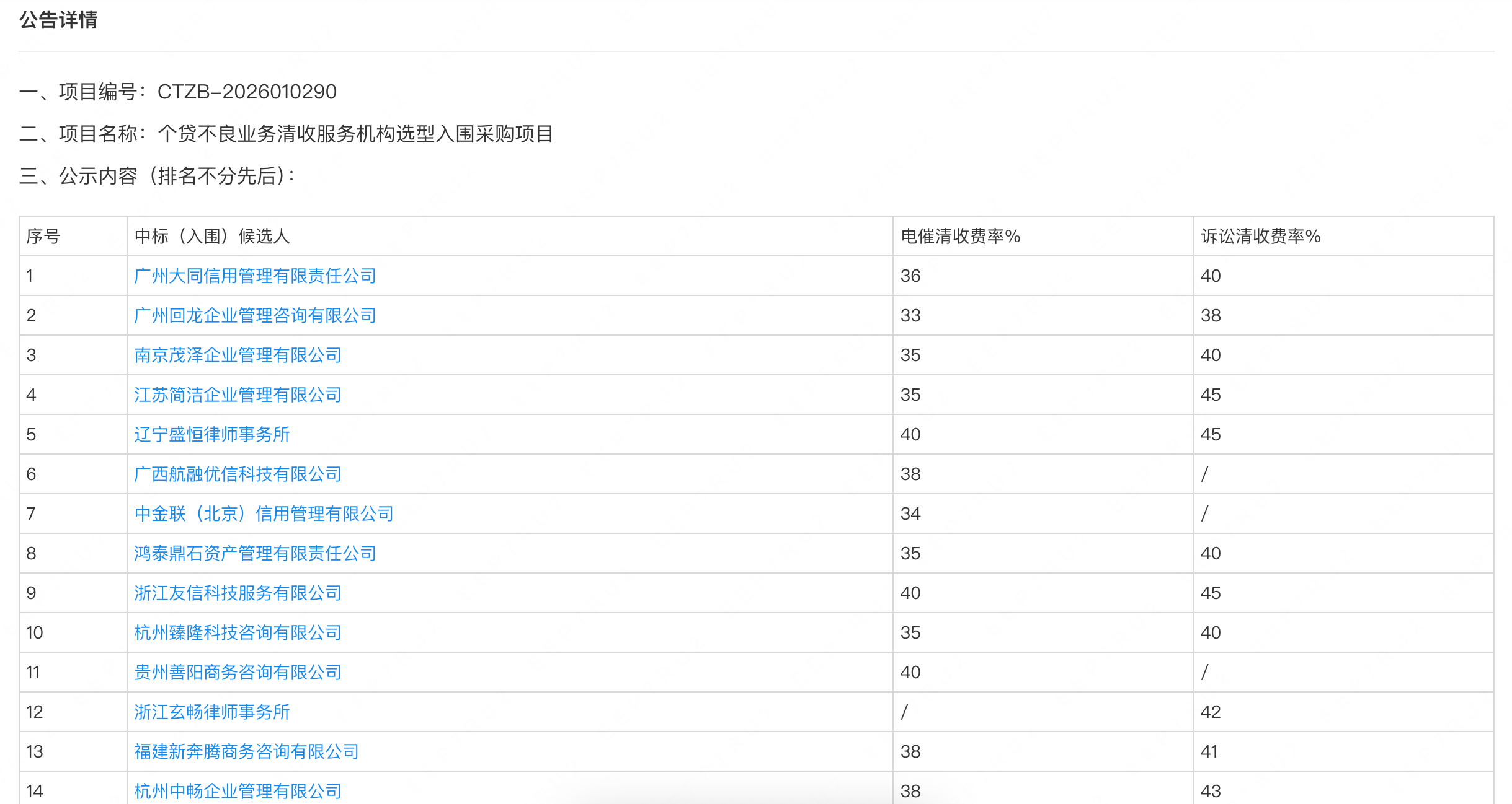 第二,專業(yè)化分工趨勢明顯。 招標(biāo)明確要求參標(biāo)企業(yè)有“個貸不良資產(chǎn)領(lǐng)域”的服務(wù)業(yè)績,這意味著“通吃”的時代已經(jīng)過去,深耕細分領(lǐng)域的專業(yè)催收機構(gòu)更受青睞。