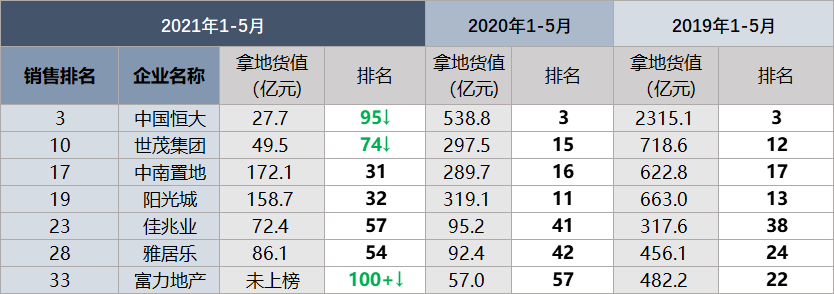 沒錯,這家企業(yè)是恒大。其2019年、2020年拿地金額始終保持前三,但其今年前五月僅支出27.7億元用于拿地。