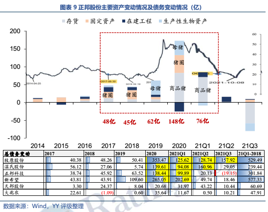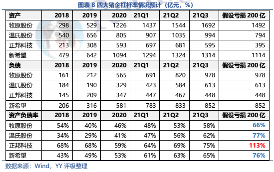公司本就規模小、杠桿率高、前期累計的利潤少,先天底子薄,而公司又踏錯周期,20-21Q1高位繼續激進擴張,進一步積累了債務負擔。當 2021年2季度豬肉價格急速下滑后,公司的報表全面惡化,預計21年末資產負債率將突破90%,凈資產僅剩27億左右,陷入財務危機中。