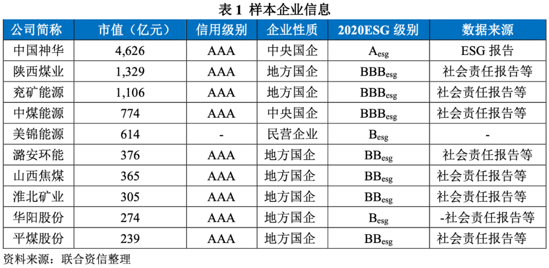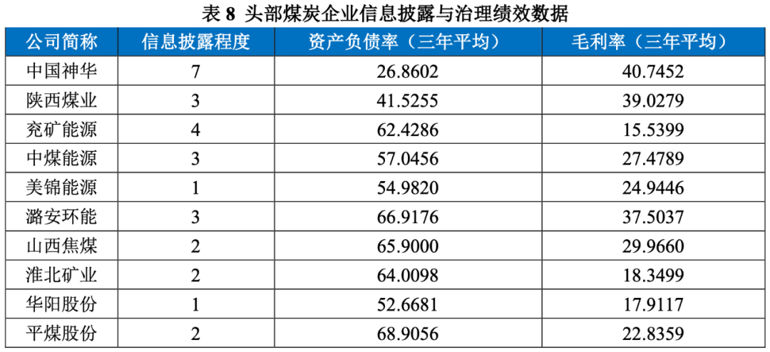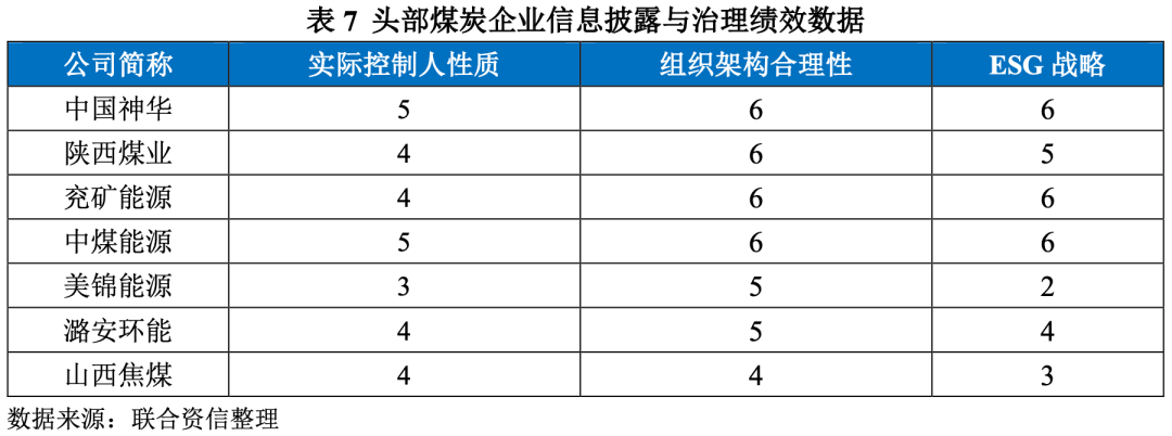 信息披露這一指標為定性指標,一方面考慮企業ESG數據可得有利于投資者了解相關信息,一方面鼓勵企業進行ESG信息披露。中國神華披露完整的ESG報告,相關數據可得,因此給予7分;兗礦能源披露社會責任報告,數據披露較完整,給予4分;美錦能源與華陽股份不披露社會責任報告,給予最低分1分;平煤股份等雖披露社會責任報告,但不包含ESG數據,給予2分。