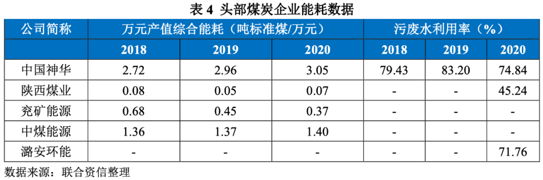 資源消耗主要包含綜合能源消耗和水資源用量,考慮總量和循環利用情況,但是具體到企業其計算方法和數據披露口徑有所差別?!毒C合能耗計算通則》(GB/T2589-2008)公布了綜合能耗的能源范圍與計算方法,一次能源包括原煤、原油、天然氣、水力、風力、太陽能、生物質能等。聯合ESG選擇萬元產值綜合能耗這一指標,以噸標準煤的耗能口徑除以營業收入。從下表來看,中國神華萬元產值綜合能耗整體較高,陜西煤業較低,這里可能存在計算口徑不一致的情況。對于口徑不一致的問題,聯合資信對具體能源消數據進行評估,并結合產能數據進行綜合判斷。