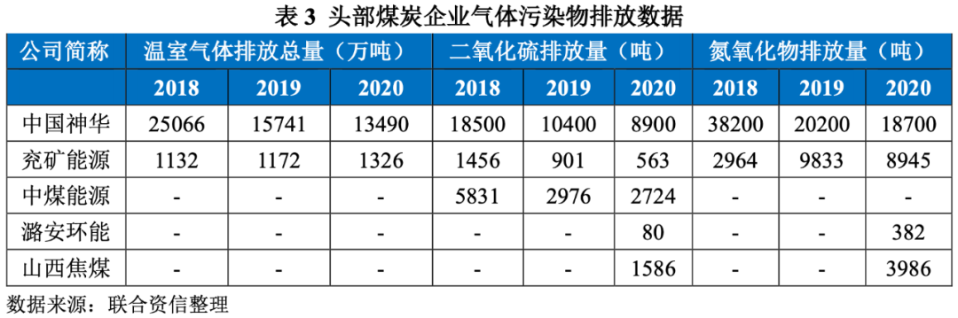 煤炭企業排放的溫室氣體排放主要包括二氧化碳、甲烷、氧化亞氮等,根據國家公布的相關計算標準折合成二氧化碳當量,單位為萬噸。根據現有煤炭企業披露情況來看,溫室氣體排放總量分為兩個口徑,范圍一是由公司生產經營業務直接產生的溫室氣體排放;范圍二:來自公司內部消耗(如外購電力、熱力、蒸汽等間接能源)所產生的溫室氣體排放。煤燃燒和煤炭開采時產生的煤層氣暫時不計入。在聯合資信ESG評級體系中,溫室氣體排放總量為兩個口徑的總和。全國碳排放管理標準化技術委員會發布的《溫室氣體排放核算與報告要求》第11部分:煤炭生產企業(GB/T 32151.11-2018)規定了煤炭生產企業溫室氣體排放的核算和報告標準。