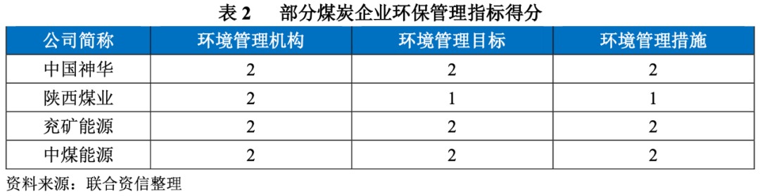 環保管理指標主要考核企業是否有常設的環境管理機構、是否有具體目標和措施。指標為定性指標,分為三檔。10家樣本企業中僅4家企業披露環保管理信息,具體看:四家企業皆設有安全、健康與環保委員會和可持續發展委員會等環境管理機構,并直接向董事會匯報,因此得分為2。從環境管理目標和措施來看,除陜西煤業以外,其余三家均明確披露了污染物減排目標,并公布了具體措施,因此得分為2。陜西煤業披露總的環境管理目標,但未公布具體數字化目標因此得分為1。不披露相關數據的6家企業環保管理得分為0。