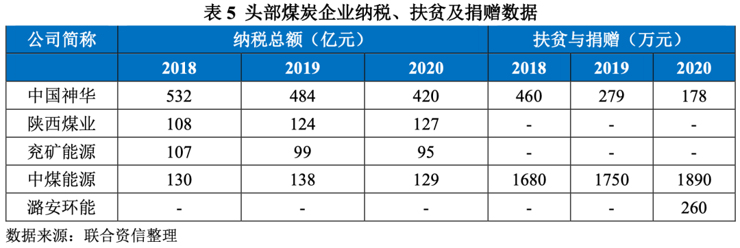 根據下表數據,中國神華納稅總額最高,且遠高于其他企業,納稅表現最好。從扶貧與捐贈金額來看,中煤能源扶貧及捐贈額度最高,2020年為1890萬元,對社會產生較好效益。