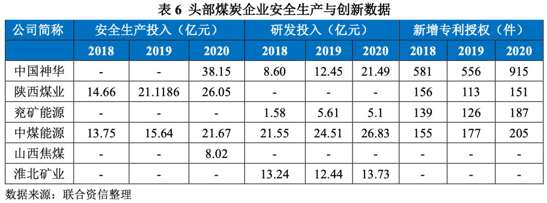 安全生產是ESG重要指標,安全問題對員工、社區以及社會都有較大的影響。從數據來看,中國神華安全生產投入最高,2020年為38億元,陜西煤業與中煤能源安全投入也較多且逐年增長,山西焦煤安全投入資金較少。創新類指標包含新增專利授權與研發投入,中國神華新增專利授權遠高于其他企業,中煤能源研發投入資金最多,2020年為26.83億元,兗礦能源研發投入資金較少,2020年為5.1億元。
