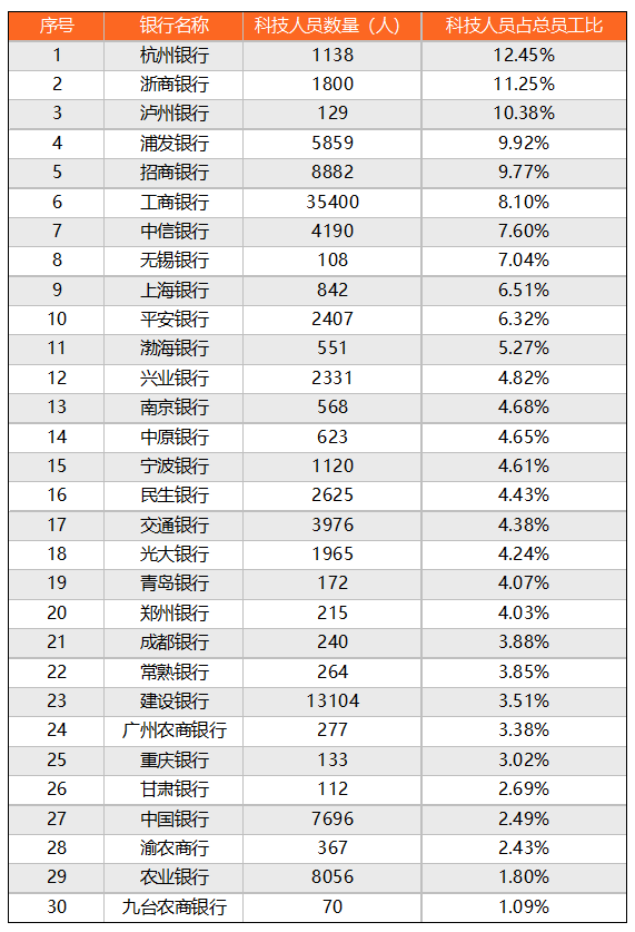 3、表中浙商銀行的科技人員數量是含科技外包人員的數量,但年報披露的總員工人數包含派遣員工、科技外包人員、附屬機構員工,所以使用了含外包的科技人員數量計算科技人員占比。
