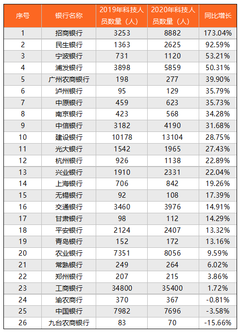 2、民生銀行2019年未披露信息科技人員數量,披露的是專業技術人員數量(專業技術人員包括從事產品研發、風險管理、信息科技、運營支持等人員),所以增長率是以2019年和2020年專業技術人員增長情況所估計的。