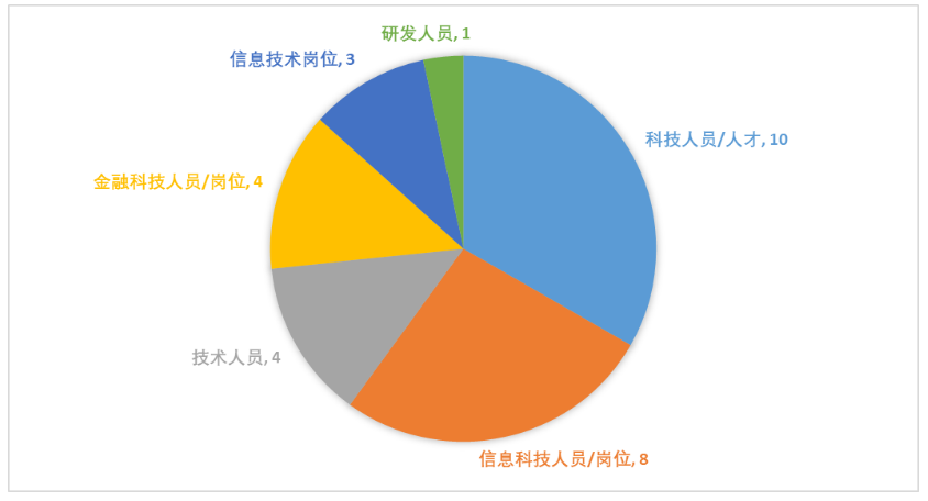 在30家披露了科技崗位的具體人員數據情況中,各家銀行對于科技崗位的命名均有所差異。零壹智庫對類似的名稱做了統一,如瀘州銀行使用的“科技人才”、渝農商行使用的“全職科技人才”統一歸類為“科技人員/人才”。經統計,使用最多的是“科技人員/人才”這一名稱,共有10家銀行使用,幾乎都為股份制商業銀行或者城商行。而國有銀行中有三家使用的是“金融科技人員”這一名稱,分別為交通銀行、工商銀行和建設銀行。而“研發人員”這一崗位名稱僅有招商銀行使用。下圖顯示了具體分布情況: