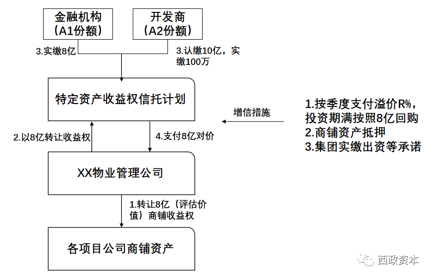 以上述產(chǎn)品架構(gòu)為例,項目公司把未售商鋪的收益權(quán)轉(zhuǎn)讓給物業(yè)管理公司,并簽署《商鋪收益權(quán)轉(zhuǎn)讓協(xié)議》;物業(yè)管理公司將商鋪收益權(quán)轉(zhuǎn)讓給信托計劃,并與信托計劃簽署《特定資產(chǎn)收益權(quán)轉(zhuǎn)讓及回購協(xié)議》,其中約定由物業(yè)公司負責(zé)對商鋪進行銷售和經(jīng)營,支付固定回報,并承諾到期后回購商鋪收益權(quán);信托計劃到期后,信托計劃管理人可發(fā)繳款指令給開發(fā)商追加資金,用于回購商鋪及收益權(quán),也即信托計劃到期后無法退出時,開發(fā)商需就認繳的份額完成資金的實繳,由此保障信托計劃的退出。
