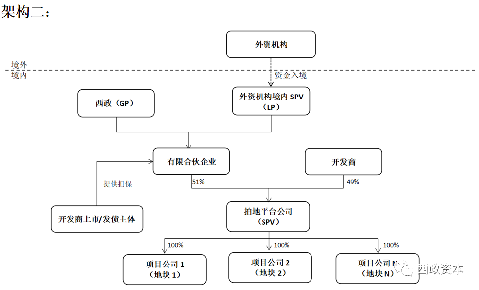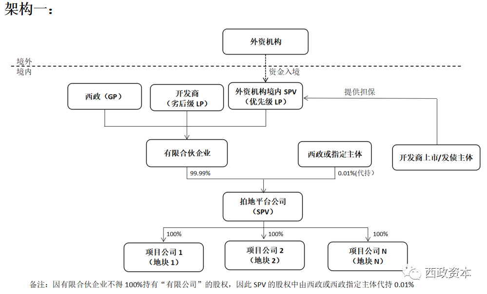 在我們操作土地款配資業(yè)務(wù)的時候,經(jīng)常會遇到開發(fā)商自有資金部分的出資方式問題。一般來說,開發(fā)商出資的方式主要是兩種,第一種是在融資產(chǎn)品層面直接認購劣后級出資(如下文的“架構(gòu)一”);第二種是融資產(chǎn)品(如基金/有限合伙企業(yè)或信托計劃)設(shè)立完成后與開發(fā)商共同出資設(shè)立SPV公司或項目公司(如下文的“架構(gòu)二”)。按我們的業(yè)務(wù)經(jīng)驗,目前大部分開發(fā)商都更偏向下文“架構(gòu)二”的處理,主要原因有以下兩點:一是基金/有限合伙企業(yè)或信托計劃等金融產(chǎn)品受到的監(jiān)管較多(比如信托或基金產(chǎn)品的托管),開發(fā)商的資金進出以及資金使用效率會受到一定的影響;二是金融產(chǎn)品直接持有SPV公司或項目公司股權(quán)的情況下,項目公司申請開發(fā)貸時需要穿透上去好幾層才能看到開發(fā)商的身影,而且控股股東或持股層級的設(shè)置不滿足“432”的認定條件時,很容易導(dǎo)致項目公司無法取得開發(fā)貸,由此亦會影響我們前融機構(gòu)的資金退出。
