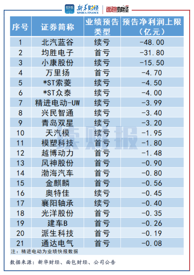 此外,萬里揚、*ST索菱虧損上限在4億元以上,精進(jìn)電動、興民智通、青島雙星虧損上限均達(dá)3億元以上。