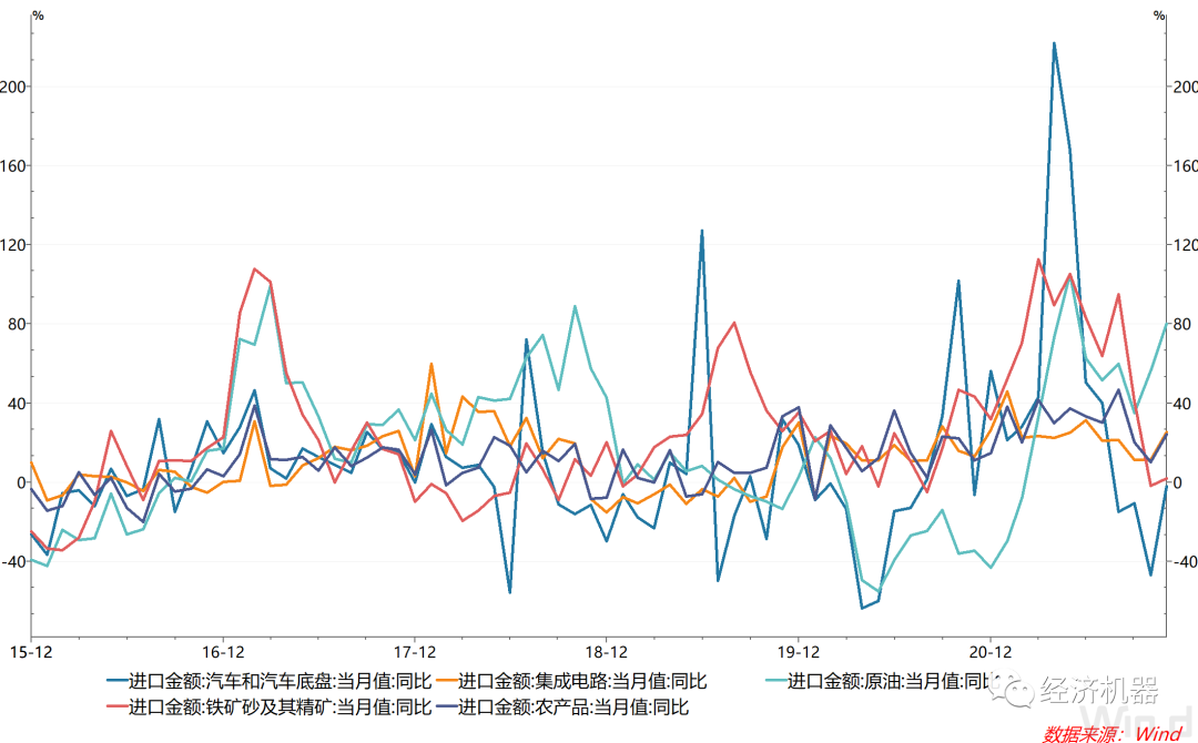 此外,隨著能源短缺的緩解,生產恢復也帶動了進口需求。上中下游(如汽車、集成電路、原油、農產品等)進口增速均有不同程度的提升(圖2)。