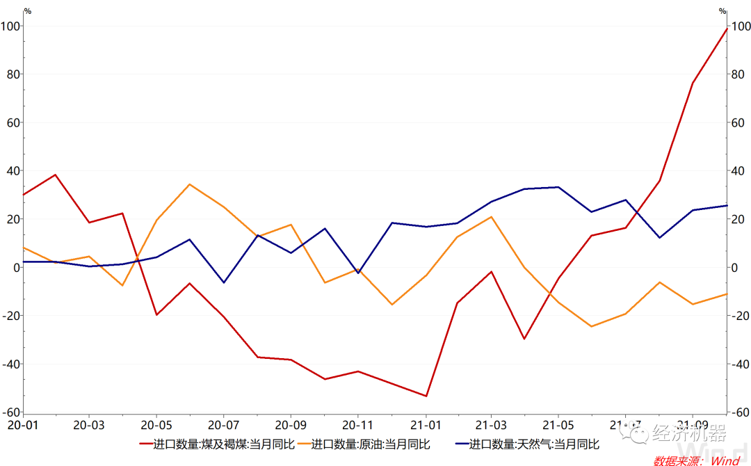 進口表現大幅超預期。11月,我國進口2538.1億美元,同比增長31.7%,較上月提升11.1個百分點,遠高于預期的18.2%。這或許得益于我國能源保供政策的強力推進。10月份以來,我國加快對煤炭等大宗商品進口的清關速度,以緩解國內能源短缺。11月,我國進口煤約3500萬噸,環比增長30.11%,同比增長98.7%(圖1)。能源保供下,部分大宗商品進口暴增,或許是進口超預期的重要推動因素。