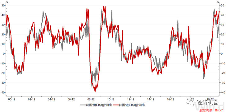 作為全球經濟金絲雀的韓國,其進出口增速是全球貿易的晴雨表,近期也持續回升。11月韓國出口同比增長32.1%,較上月加快8個百分點,進口同比增長43.6%,較上月加快5.9個百分點,均連續兩月回升,進口同比增速更是接近8月份的高點,這也表明全球經濟短期增長無憂(圖7)。