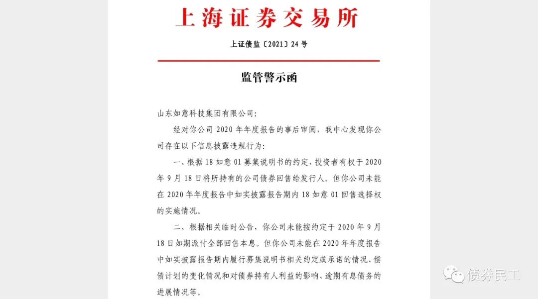 根據網站的公開信息,上海證券交易所于2021年5月16日向山東如意科技集團有限公司(以下簡稱“如意集團”)出具監管警示函,主要原因是未能披露18如意01的回售情況和未能在2020年度報告中如實披露應履行的信息披露義務。