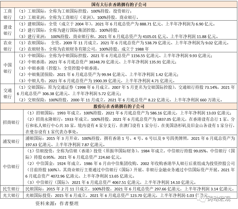 2、10家銀行(5家國有大行與5家股份行)在香港擁有子公司