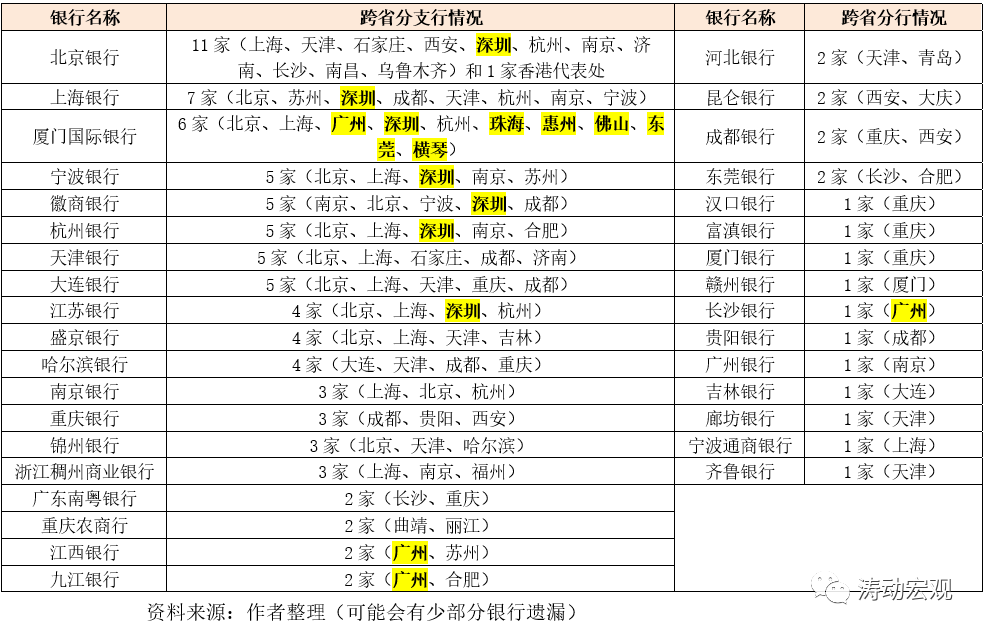 目前僅有1家地方性銀行同時在廣州與深圳兩地設有分行,即廈門國際銀行。需要指出的是,除廣州與深圳兩地外,廈門國際銀行還通過澳門國際銀行在惠州、佛山、東莞等地設有支行以及在橫琴設立了代表處。