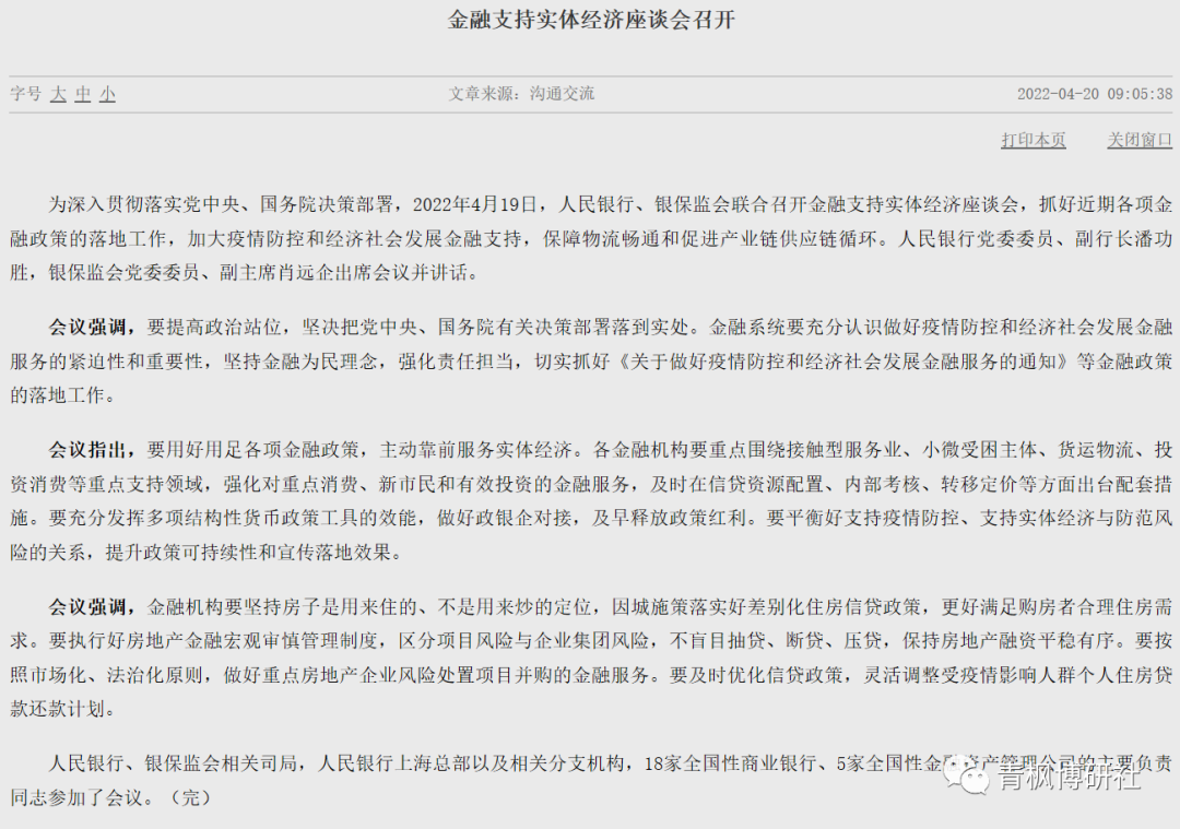 二、沒有降息的一天也有大事發(fā)生。2022年4月20日,央行官網(wǎng)刊發(fā)一則新聞,2022年4月19日央行與銀保監(jiān)會召開金融支持實體經(jīng)濟座談會,雖然全文只有700余字,但釋放的信息是有一定價值的。具體如下,