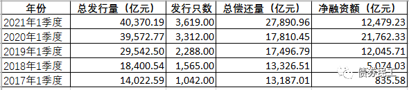 單純從發行數據來看,2021年第一季度的發行數據已經非常驚人。但是如果是縱向五年來對比的話,可以看出2021年第一季度的信用債券發行總額和發行只數均創新高!(添加債券民工個人微信,獲取最近五年一季度信用債券凈融資統計表)這個發行總量和發行只數,是真的沒讓人想到的。