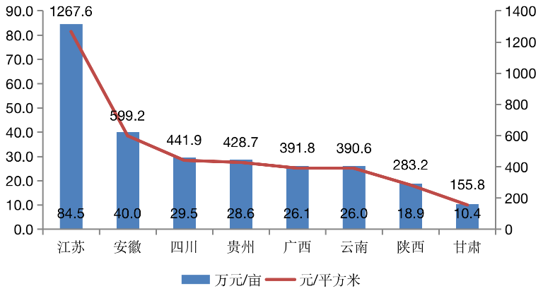 注:為便于對(duì)照本章其他章節(jié),上圖同時(shí)列出“萬(wàn)元/畝”和“元/平方米”的單位