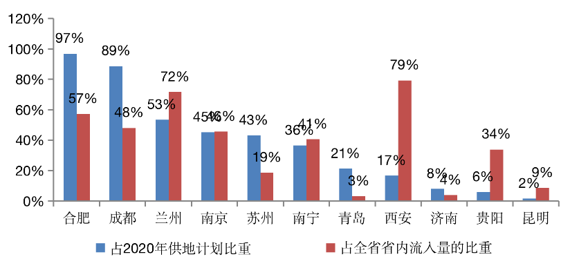 聚焦到城市來(lái)看,東部核心城市對(duì)“增減掛鉤”指標(biāo)的依賴度更高,如南京、合肥自2016年以來(lái)購(gòu)買的指標(biāo)量占2020年土地計(jì)劃供應(yīng)量的比例都在5成以上,其中合肥更是高達(dá)97%。“增減掛鉤”流轉(zhuǎn)的建設(shè)用地已成為這些城市重要供地來(lái)源之一。