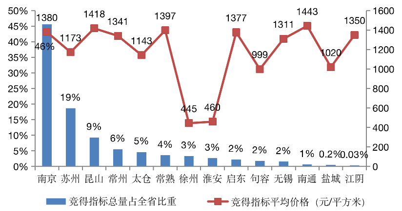 從各城市報(bào)價(jià)來(lái)看,徐州、淮安等蘇北城市比較青睞底價(jià)在30萬(wàn)元/畝(折合450元/平方米)左右、價(jià)格比較低的指標(biāo),并且加價(jià)幅度多不超過(guò)3000元/畝,比較謹(jǐn)慎;反之,蘇州、南京等中心城市在競(jìng)價(jià)中出價(jià)比較高,多在90萬(wàn)元/畝以上,并且加價(jià)幅度也較大,多在5萬(wàn)元/畝以上。值得注意的是,加價(jià)幅度最高的這8%用地指標(biāo)均是江蘇省會(huì)南京競(jìng)得的。就各市獲得流轉(zhuǎn)土地的平均價(jià)格來(lái)看,南京高達(dá)92萬(wàn)元/畝,即1380元/平方米,明顯高于1268元/平方米全省平均水平。