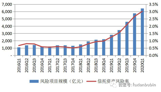 二是信托行業風險資產規模及不良率持續攀升。在金融去杠桿、強監管的宏觀政策背景下,銀行表外資金加速回表,同時平臺公司舉債受限,企業現金流相對緊張,部分信托公司展業較為激進,前期高速發展積聚的風險開始加速釋放,導致信托計劃逾期甚至違約事件增多。早在2020年一季度,信托業協會在2020年6月發布的《2020年1季度中國信托業發展評析》中表示,隨著風險資產規模的增加以及行業整體信托資產規模的壓降,信托資產風險率也在持續提升。2020年1季度末,信托業資產風險率為3.02%,較2019年末提升0.35%;但環比增幅較2019年末的0.57%下降了0.22個百分點。從風險項目數量和風險資產規模的環比變動來看,2020年1季度末,信托業風險項目個數為1626個,環比增加79個,增幅為5.11%。2020年1季度末,信托行業風險資產規模為6431.03億元,環比增加660.56億元,增幅11.45%。從同比來看,2020年1季度末信托項目數量和風險資產規模同比增幅分別為61.63%和127.20%。2020年1季度,在新冠疫情以及監管部門加大風險排查力度的影響下,信托行業風險仍在持續暴露。但預計信托風險資產規模變化2020年將趨平穩,行業風險整體可控。