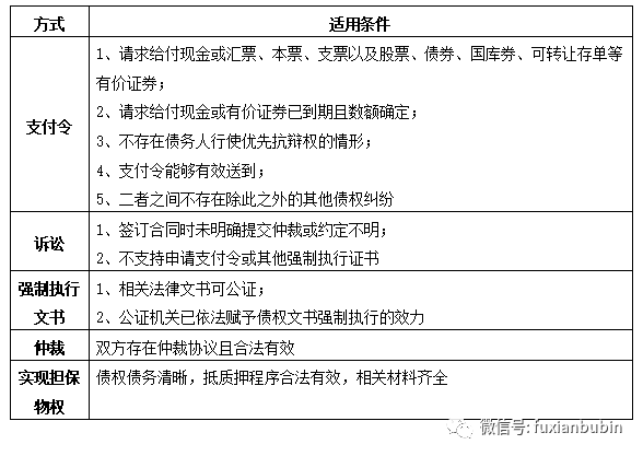 即通過民事訴訟、民商事仲裁、民事督促(支付令)、執行公證債權文書、直接向法院申請實現擔保物權的方式,確立債權的合法性,依靠強制程序收回債權的清收處置方式。主要適用于債務人出現生產經營陷入困境、財務狀況嚴重惡化,債務履行困難,停止營業或實際控制人下落不明,債務人還款意愿差,有明顯轉移資產或逃廢債務的行為,主要負責人或實際控制人涉及刑事案件等情形。其具體適用情形如下表: