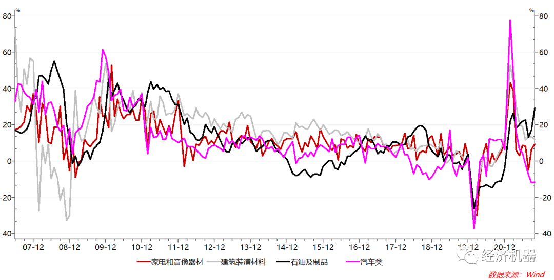 具體看,可選消費中,汽車和建筑裝潢保持疲弱,石油制品和家電增速改善。汽車消費下降,可能與供應鏈斷裂下的“芯片危機”有關,更反映了周期下行下的需求疲弱。建筑裝潢銷售額下降與近期地產市場快速惡化趨勢像吻合。石油及制品增速大幅上升,更多地是油價高企帶來的價格效應。考慮到汽車銷量的下降,剔除價格因素后,石油消費會弱的多(圖4)。
