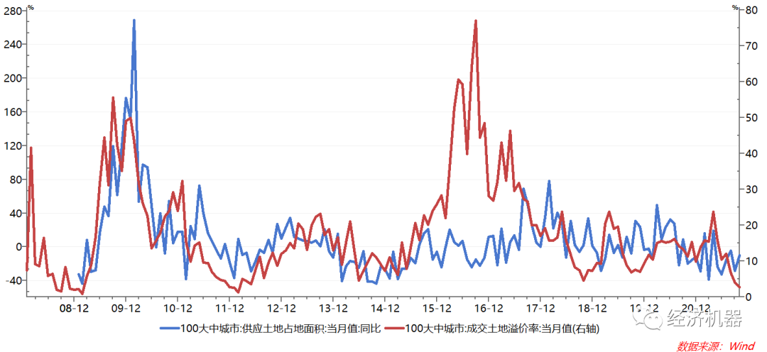 圖8:百城供地面積同比,及土地溢價率