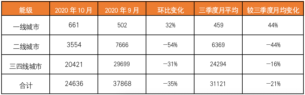 表:2020年10月各能級(jí)城市土地供應(yīng)變化情況(萬平方米)