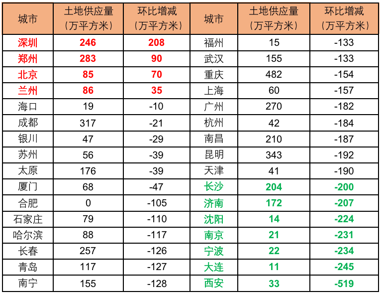注:考慮到各城市土地成交規(guī)模變動(dòng)較大,實(shí)際規(guī)模變化更能直觀反映供應(yīng)量的變動(dòng),故在上表中不顯示環(huán)比變動(dòng)。