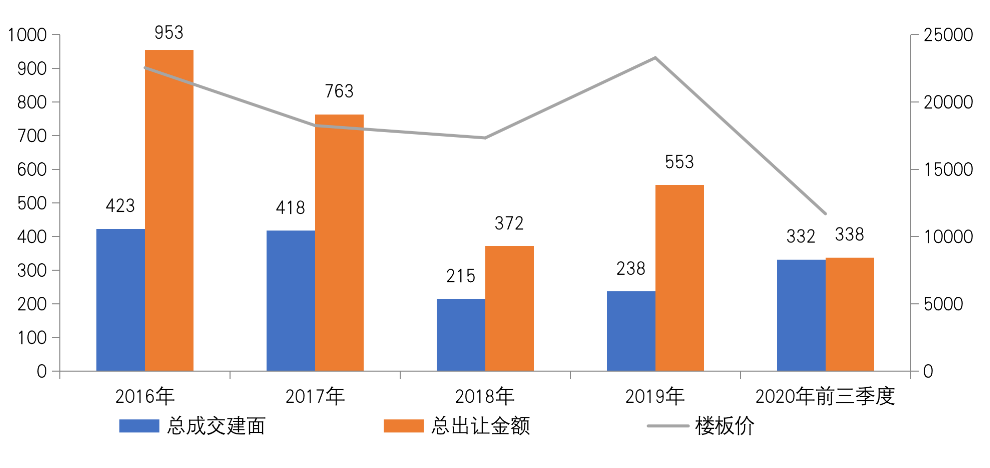 圖:2016-2020年前三季度深圳經(jīng)營性土地總成交建面、成交金額和樓板價(jià)(萬平方米、億元、元/平方米)