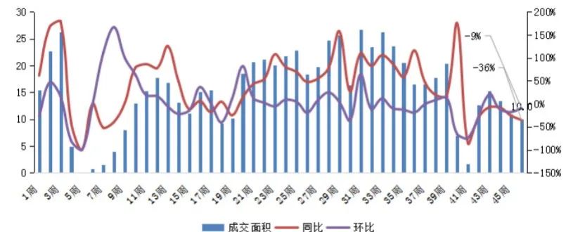 截止11月15日,深圳二手住房周成交面積同、環(huán)比齊跌,成交體量回落至10萬平方米,環(huán)比跌9%,同比跌36%。新政后二手住房市場需求大幅縮量,預(yù)計(jì)后續(xù)市場規(guī)模短期內(nèi)仍將低位調(diào)整。