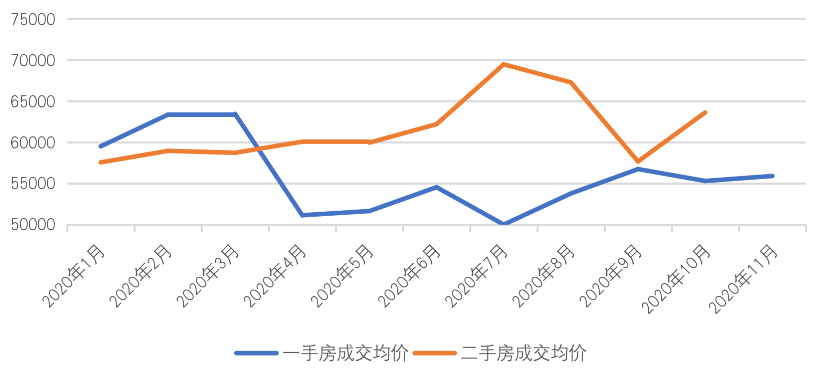 一手房方面,均價(jià)受市場及政策更為明顯,2020年6月在疫后恢復(fù)階段曾出現(xiàn)過一個(gè)小高峰,隨后受政策影響跌入全年最低谷,為50011元/平方米,隨后再緩慢恢復(fù)。