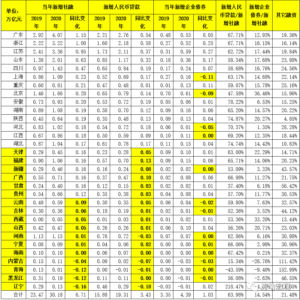 (一)實際上2021年4月1日的新聞發(fā)布會上央行便表示“已經(jīng)注意到了關(guān)于區(qū)域信貸投放平衡的問題”。而從數(shù)據(jù)上看2020年全年新增社融與新增信貸投放分別高達34.86萬億和18.89萬億(較2019年分別多增9.29萬億和2.01萬億),但主要集中在廣東、浙江、江蘇、山東、四川、上海、重慶、北京、安徽等地區(qū),而諸如遼寧、黑龍江、青海、內(nèi)蒙古、海南、寧夏、河南、山西、西藏、吉林、云南等地區(qū)實際上并沒有獲得較多的融資支持(主要以東三省、西北地區(qū)以及中部地區(qū)的省份為主)。