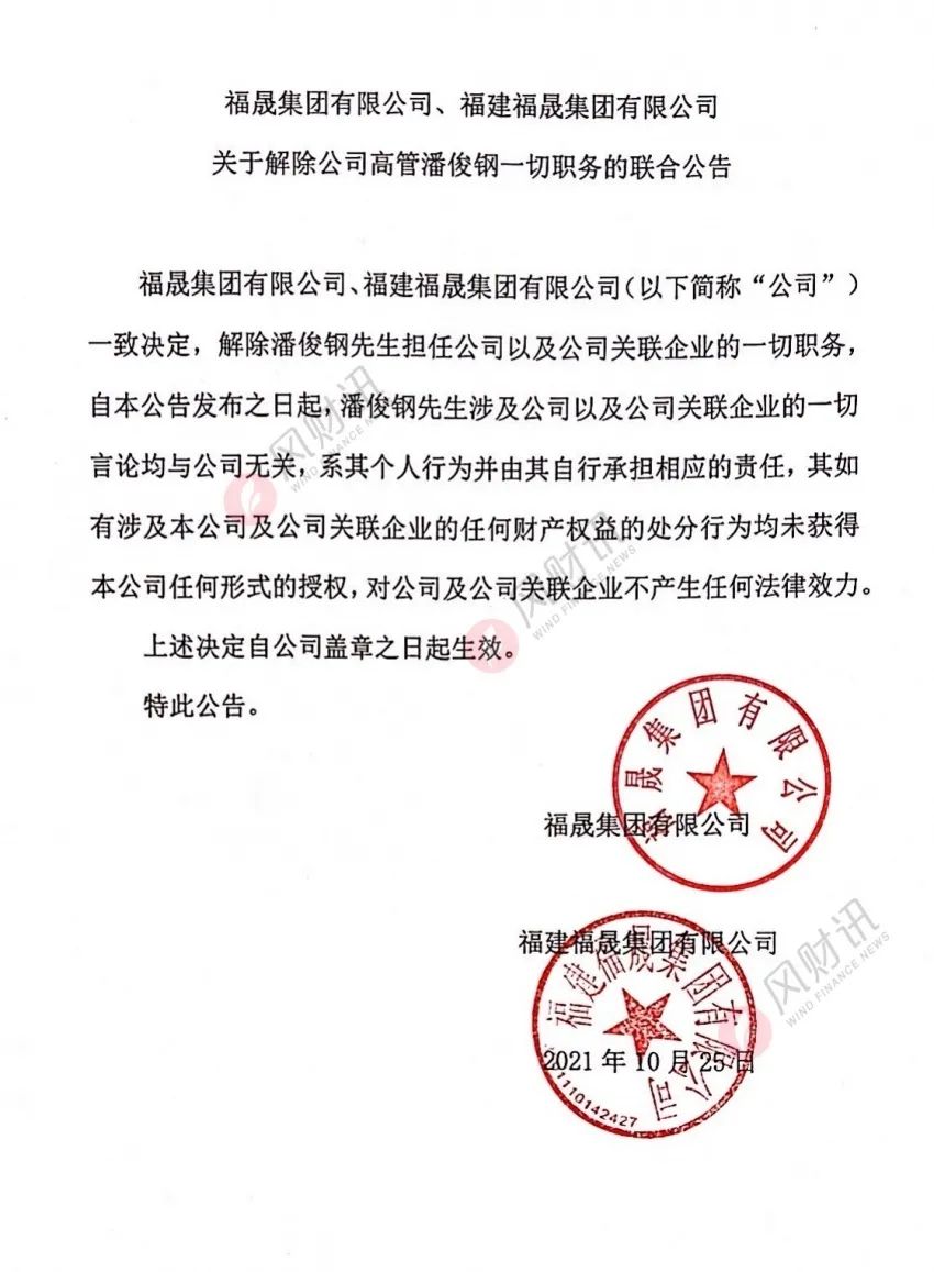 福晟集團有限公司、福建福晟集團有限公司共同發布了一份名為《關于解除公司高管潘俊鋼一切職務》的聯合公告,并加蓋兩家公章。