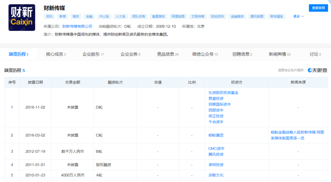 天眼查顯示,財新傳媒成立于2009年,是提供財經新聞及咨詢服務的全媒體集團。成立以來,公司共經歷五次融資。