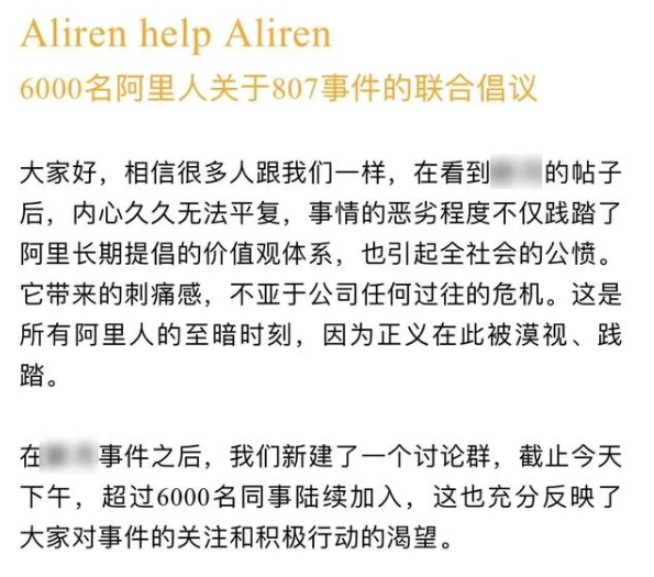 如有2億閱讀量的微博話題#阿里回應破冰文化傳言#就登上了熱搜,但#阿里巴巴員工被侵犯#坐擁7億閱讀量卻上不了熱搜;又如另一登上熱搜話題的6000阿里人關于807事件的聯合倡議,雖然其代表的是阿里內部正義人士的發聲,但用女員工曝出侵犯的時間,而非十天前女員工被侵犯的真實時間定義事件名稱,引發了不少網友的不滿。