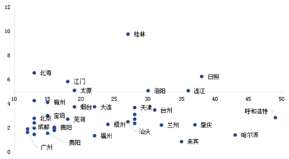 短期庫存較高城市則包括桂林、天津、洛陽、蕪湖等城,這一類城市土地消化周期均低于5年,但商品房消化周期均超過12個月,其中桂林、北海已升至40個月以上。