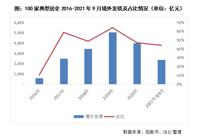 而2021年以來,房企債務違約事件增加,且逐步蔓延至頭部房企,同時違約產品從此前的信托貸款等非標產品,蔓延到境內公募債違約,從而引發公募債券的信用風險;而疊加房貸兩集中等政策的影響,境外投資者對未來房地產行業的發展有所擔憂,是以近期房企境外發債市場波動較大,房企境外新債發行受阻。2021年前九月房企境外發債融資額僅占2021年全年到期金額的75%,72%的房企新發行債券小于2021年到期債券總額,而2020年前九月境外發債是2020年全年到期金額的2.42倍,彼時僅有43%的企業發行新債低于到期債券。