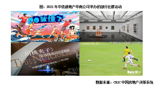 2021年中鐵建地產華南公司以家庭為原點,以多維度,多聯結,全覆蓋的社群內容打造了多場社群活動,如舉辦業主足球賽、贊助《胡桃夾子》芭蕾舞劇等。全年累計舉辦36場社群活動,吸引近800組新老客戶互動參與,同時發布推文流量超1.3萬,有效擴大華南公司社群影響力,提升業主粘性,吸引新老客戶互動參與。