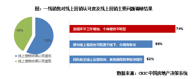 2020年疫情以來,線上營銷逐步成長為企業的常規手段之一,根據CRIC的調研,2021年頭部房企線上客流的占比從2020年的18%再度上升至了2021年的23%,繼續保持增長勢頭。但現階段我們也發現一線售樓團隊對于線上營銷認識仍然不足,平均認同度僅有42%,并且74%的一線銷售員反饋線上營銷導致流程環節工作增加,個體增效不明顯,58%認為部分線上客流也可能源于線下,分傭有爭議,52%的認為團隊缺乏線上運營培訓,系統使用效率有待提升。因此不論是技術層面還是從業人員教育層面,線上營銷的發展仍需要時間。