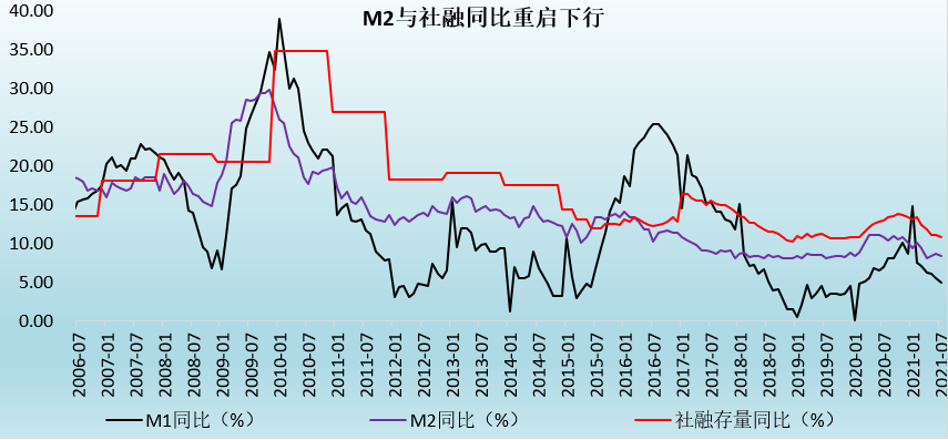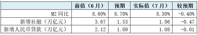 2021年8月11日(周三),央行發(fā)布7月金融統(tǒng)計(jì)數(shù)據(jù),新增社融與新增人民幣貸款、M2同比增速均不及預(yù)期。2021年7月,新增社會(huì)融資規(guī)模和新增人民幣貸款分別為1.06萬(wàn)億和1.08萬(wàn)億,較預(yù)期分別少增0.47萬(wàn)億和0.01萬(wàn)億,在近五年的7月新增數(shù)據(jù)中也明顯處于低位(2017-2020年的7月新增社融分別為2.12萬(wàn)億、1.84萬(wàn)億、1.29萬(wàn)億和1.69萬(wàn)億)。同時(shí),2021年7月M2同比降至8.30%,較預(yù)期值大幅下挫0.40個(gè)百分點(diǎn)。