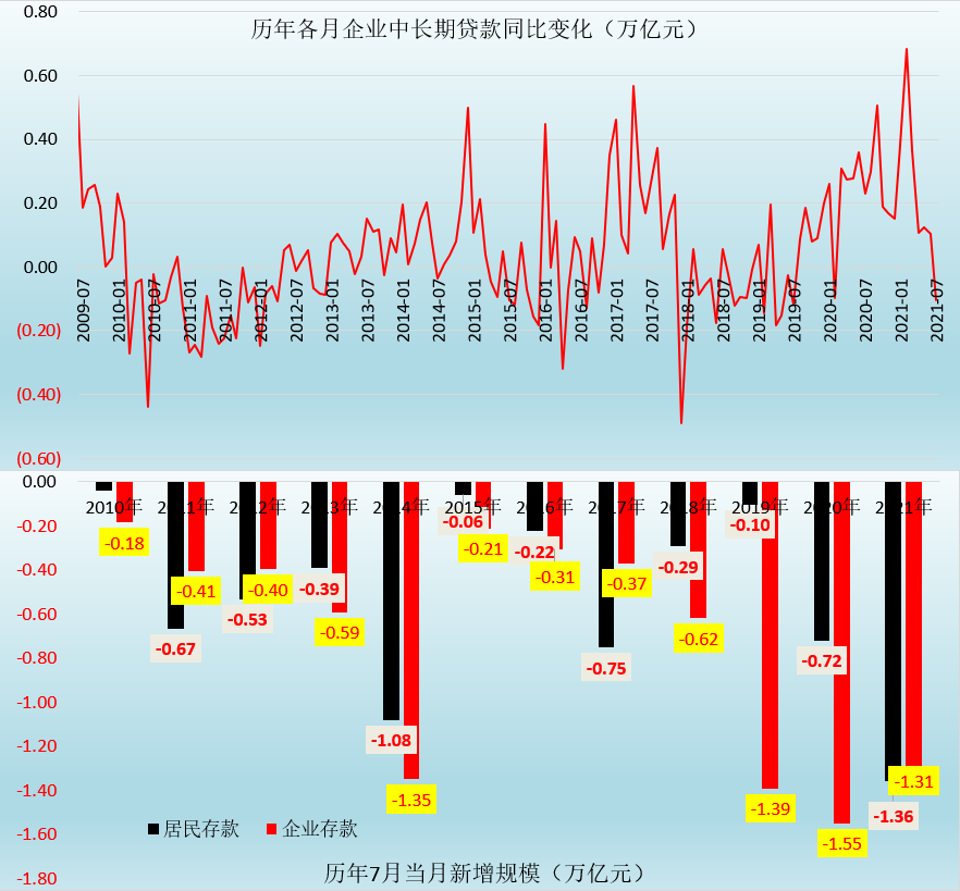 2021年7月,企業(yè)中長(zhǎng)期貸款新增0.49萬(wàn)億,同比少增0.10萬(wàn)億,這是自2020年2月以來(lái),企業(yè)中長(zhǎng)期貸款同比首次出現(xiàn)少增。由于企業(yè)中長(zhǎng)期貸款代表著企業(yè)主動(dòng)擴(kuò)大產(chǎn)能的意愿,這意味著目前企業(yè)主動(dòng)生產(chǎn)的意愿并不強(qiáng),資金可能已經(jīng)出現(xiàn)脫實(shí)向虛的跡象,值得政策部門關(guān)注。